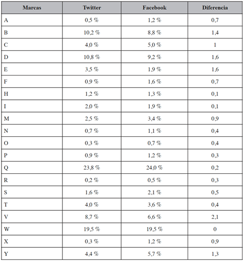 Al clasificar el uso de marcas por tipo, las periodísticas son las más utilizadas en Facebook y en Twitter, con un 76 % y 73 % respectivamente. En segundo lugar, están las marcas digitales, con un 12 % en ambas; luego, las retóricas, con un 8 % en Facebook y un 12 % en Twitter. Por último, las connotativas tienen un 4 % en Facebook y, un 3 % en Twitter. Entonces se puede observar nuevamente que existe coincidencia en el tipo de narrativas. Es de interés de todos modos que Twitter presente una incidencia de marcas periodísticas un poco más baja que Facebook, en favor de los recursos retóricos. Considerando la brevedad de los tuits, se destaca que esta plataforma dé espacio a la argumentación quitando muy levemente el protagonismo a los datos.
