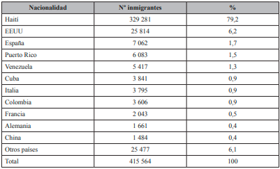 Número y porcentaje de migrantes en República Dominicana, según nacionalidad relevada en los últimos estudios disponibles
