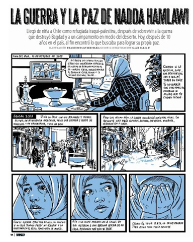En suma, las crónicas gráficas oscilan entre el discurso de la diferencia y el de autoridad. En la mayoría de las historias el rol del gobierno queda reducido hasta desvanecerse ante la trama cultural en la que se desenvuelven las vidas. Las excepciones son la última crónica de la serie, “La guerra y la paz de Nadda Hamlawi” en la que aparece incluso la figura de Michelle Bachelet dando la bienvenida a Chile a la familia iraquí que salió de un campo de refugiados mientras señala “yo también fui refugiada” (figura 1).
