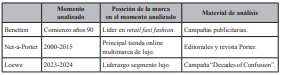 Como paradigma de la primera etapa encontramos el caso de Benetton y su modelo publicitario, en la segunda etapa el caso de Net-a-Porter y su modelo editorial, y un tercero en el caso de Loewe y su campaña “Decades of Confusion”. Este último, por su novedad (se trata de una campaña de 2024) responde a un análisis más original y sin referencias de estudios previos.