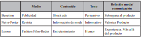 A través del método del caso, este trabajo realiza una aproximación a tres marcas de renombre y significativas por su relación entre moda y comunicación: Benetton, Net-a-Porter y Loewe.