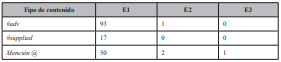 Algo similar sucede con los contenidos con la etiqueta #supplied. Se han encontrado 17 posts de este tipo, perteneciendo todas ellas a la E1. Por último, se han hallado 53 contenidos con menciones específicas —@—. El 94,34 % de las publicaciones pertenecen a E1, el 3,77 % a E2 y el 1,89 % pertenecen a E3.