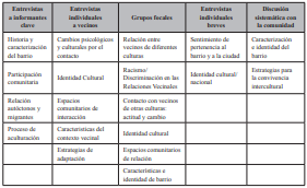 En el análisis de los datos, obtuvimos un total de cuatro temas en las entrevistas a los informantes clave, cinco temas en las entrevistas individuales, seis temas en los grupos focales, dos temas en las entrevistas focalizadas breves, y dos temas en la discusión sistemática con la comunidad (ver tabla 1). En este artículo profundizaremos en dos temas emergentes de estas etapas: la convivialidad (que los vecinos categorizaron como “relación entre vecinos de diferentes culturas”) y la identidad de barrio.