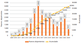 Los hallazgos muestran que, para el tercer trimestre del 2024, en la Ciudad de México, existen 26 582 alojamientos dentro del catálogo de esta plataforma austera. El gráfico 1 muestra el crecimiento de hospedajes dentro de la plataforma, evidenciando que el 2016 fue el año con mayor número de espacios registrados;[3] de allí en adelante, el 2021 es el año con menor registro de nuevos alojamientos, por lo que puede ser un efecto (in)directo de la pandemia.