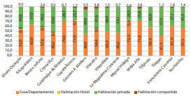 Ahora bien, un elemento clave para este tipo de análisis no solo yace en la ubicación, sino su articulación con la composición de los hospedajes, esto es, qué tipo de espacios se alquilan según la alcaldía en la que se encuentran. El gráfico 3 muestra esta distribución.