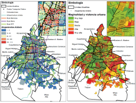 Una vez que se tiene conocimiento sobre dónde se concentran estos alojamientos, resulta claro observar cuál es la interseccionalidad que adquieren estas colonias en cuanto a servicios como transporte y marginación/violencia urbana.[5] Así, el mapa 2 muestra el entrecruzamiento de estos factores en la Ciudad de México.