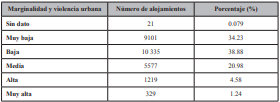 En cuanto a la marginalidad y violencia urbana se muestra una tendencia similar, pues un buen porcentaje de los alojamientos se encuentran en lugares donde estos indicadores son bajos, interviniendo directamente en la producción de las subjetividades urbanas de los huéspedes. Para reafirmar esta idea se presenta la tabla 1.