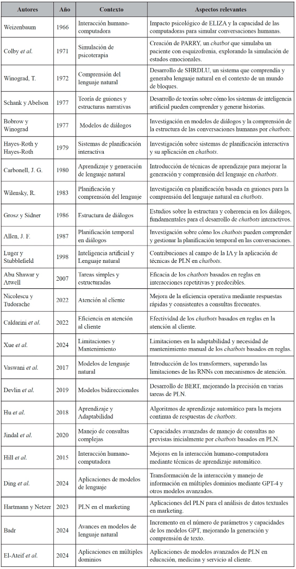 Nota. Contribuciones claves de los autores y desarrollo de los chatbots y el procesamiento del lenguaje natural desde 1960 hasta el 2024.Aplicaciones actuales y futuras
