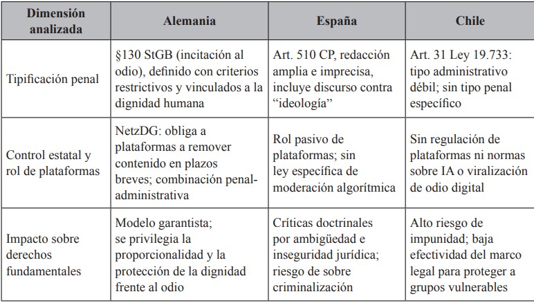 Este artículo aborda el problema desde una perspectiva jurídico-dogmática y comparada, examinando el tratamiento legal de los discursos de odio en Chile, Alemania y España, así como los estándares del sistema interamericano de derechos humanos. A partir de ello, se propone un conjunto de criterios normativos que permitan enfrentar este fenómeno de manera legítima, proporcional y conforme a los principios del constitucionalismo democrático.