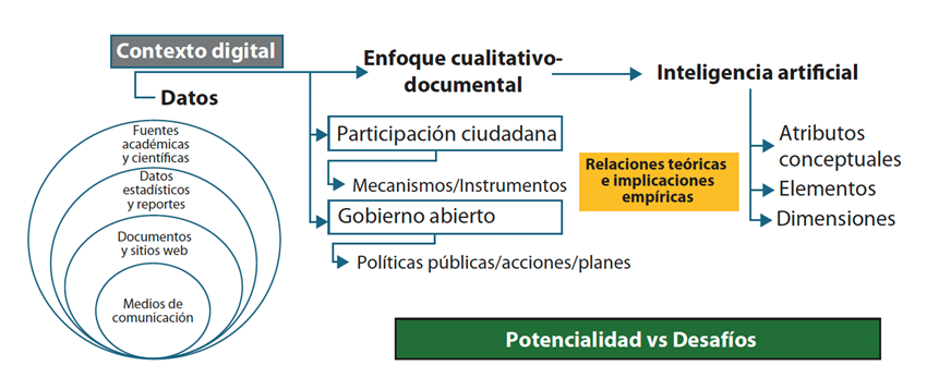 Este trabajo utiliza un enfoque cualitativo-documental, orientado a analizar y explicar la transformación de la participación ciudadana y el gobierno abierto en la era digital, con un énfasis particular en la propuesta y el potencial actual de la Inteligencia Artificial (IA) en estos ámbitos. Así, el enfoque cualitativo[1] permitió en un primer momento analizar los principales atributos conceptuales, dimensiones y elementos de observación la participación ciudadana, el Gobierno Abierto y la Inteligencia Artificial en el contexto digital.