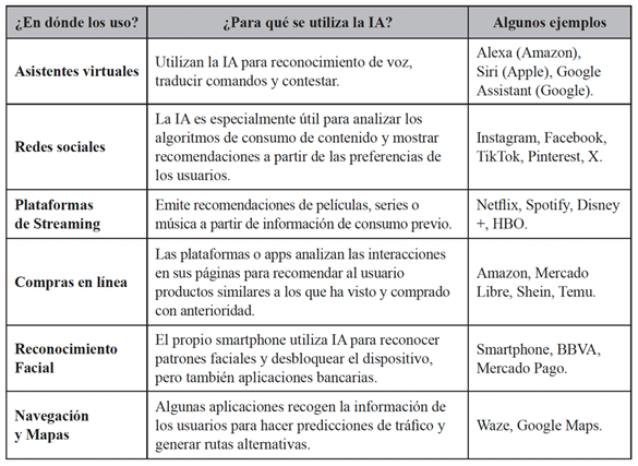 Algunas de sus primeras aplicaciones claras fueron tan discretas que muchos no son conscientes del tiempo que llevan conviviendo con la IA (véase tabla 1). La encontramos en asistentes virtuales, redes sociales, plataformas de streaming, compras en línea, traducciones automáticas, reconocimiento facial, navegación y mapas, salud y bienestar (por ejemplo, los relojes inteligentes que toma los datos biométricos para hacer predicciones), videovigilancia, entre muchos otros.
