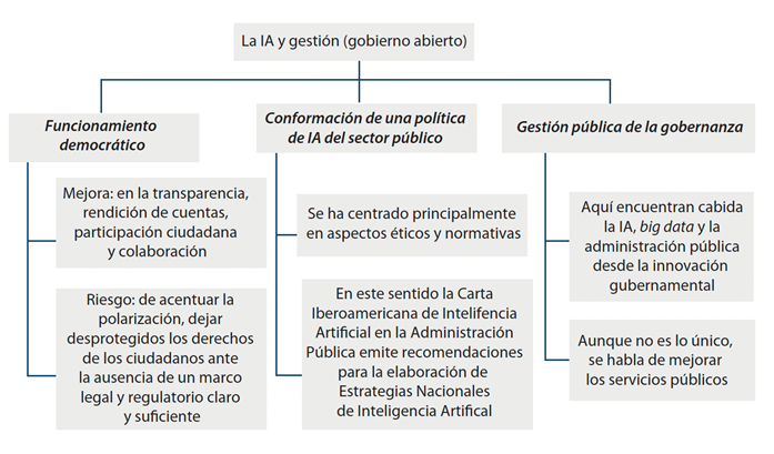 En el caso particular de la ciencia política y la administración pública, se ha estudiado el tema a partir de gobierno abierto y gobierno digital. El primero es un paradigma de la gestión pública que busca cambiar las relaciones entre gobierno, ciudadanos y sector privado para el desarrollo de democracias de calidad a través de la modernización de la administración pública. En gobierno abierto el desarrollo tecnológico no es un fin en sí mismo, pero es un instrumento muy importante. En cambio, desde el gobierno digital (gobierno electrónico, e-Government, e-gov) es un requisito indispensable la modernización digital de la administración pública, el uso de la IA y su presencia en la atención ciudadana a través de los chatbot, son referentes permite conocer los usos y aplicaciones de la IA en la vida de las personas.