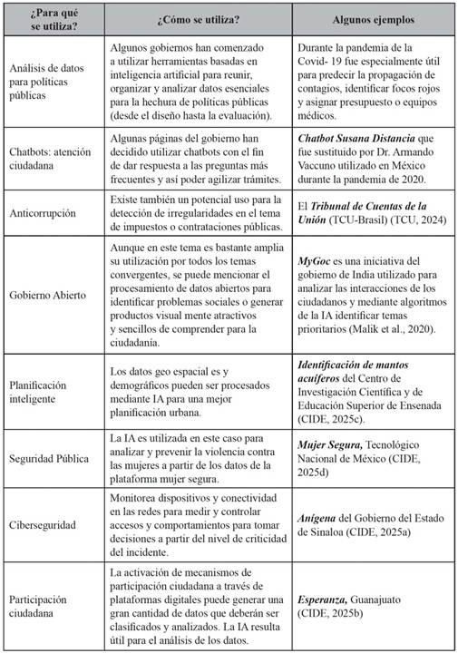 En el caso de México, la IA ha sido utilizada principalmente por el gobierno con el fin de proporcionar mejor atención ciudadana y agilizar trámites y servicios. Como se puede ver en la tabla 2, la IA se está utilizando para el proceso de políticas públicas al permitir analizar una gran cantidad de datos en muchísimo menor tiempo, e incluso se utiliza para la seguridad pública, por ejemplo, rastreando placas con denuncia de robo o analizando actividades sospechosas. Incluso puede llegar a ser un gran aliado para la detección de fraudes y evitar así actos de corrupción. Su aplicación es inmensa y aun en este momento se descubren nuevos usos.