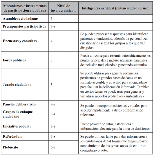 The incorporation of technological tools into people’s lives has generated changes, both in their daily activities (such as working, studying, obtaining information, entertaining, shopping, etc.) and in their forms of social interaction with other actors, such as with the State (its character as governed people). Thus, such tools (the internet, big data, artificial intelligence, etc.) determine—in part—the form of interaction between those governed and those who govern and are used as strategies to streamline processes and service administration, while maintaining democratic and open government principles. Currently, within these tools, Artificial Intelligence represents a paradigm similar to that of the internet (at the time of its emergence and rise) due to the implications it can have on the way we govern. However, how does AI impact participation and governance? Thus, this paper aims to analyze and explain the transformation of citizen participation and open government through the use of new information and communication technologies (such as AI). It employs a qualitative documentary approach based on a review of specialized literature and statistical data. It establishes that the use of AI in government and citizen participation represents potential opportunities, but also challenges and risks, as its changes will continue to be constant.