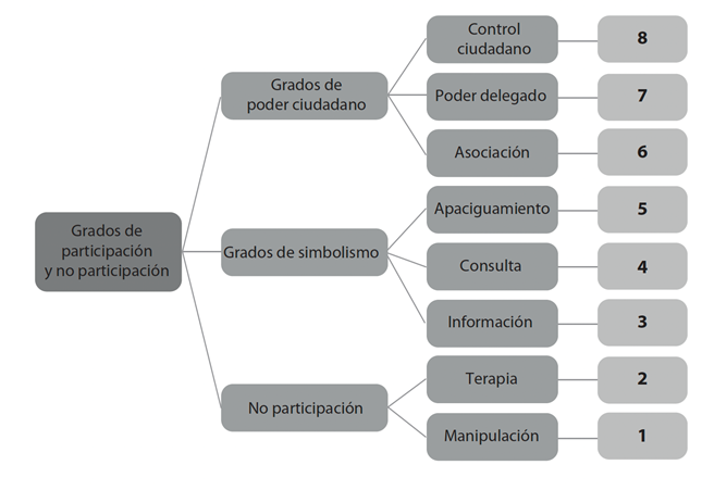 Fuente: Arnstein (1969).La explicación al diagrama anterior radica en que en los primeros tres niveles no hay participación propiamente dicha, los niveles 1 y 2 son peligrosos porque, en sus palabras, fueron creados con la intención de hacer pensar a la ciudadanía que efectivamente participan, pero no influyen o toman decisiones. Los siguientes niveles corresponden a la información y consulta, en el cual, los ciudadanos acceden a información y pueden emitir opiniones, pero su influencia en las decisiones no está garantizada ni es vinculante. En el nivel de apaciguamiento existe mayor presencia de ciudadanos y de amplios sectores antes relegados, pero los tomadores de decisiones conservan la última palabra. Por otro lado, en el nivel de asociación el poder se redistribuye entre los actores sociales de tal forma que pueden darse un espacio de negociación (Arnstein, 1969).