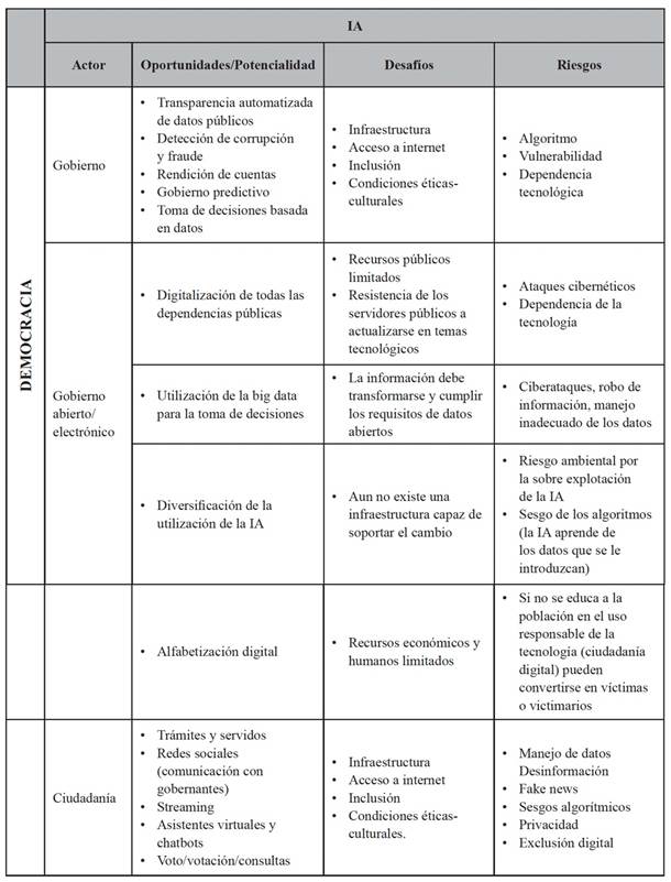 Finalmente, se hace un análisis exhaustivo al impacto de la IA tanto en el gobierno como en la participación ciudadana, se advierten sus potencialidades y oportunidades que pueden representar para mejoras, pero también los riesgos y desafíos que enfrentan, por lo que resulta necesario establecer bases investigativas para determinar cómo enfrentarlos.