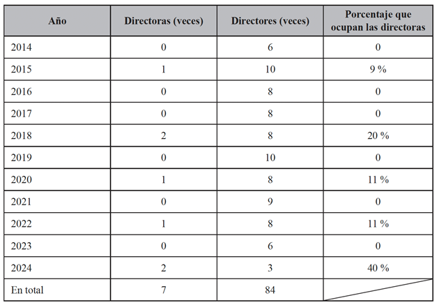 Tanto el equipo directivo como el de guionistas se domina por los hombres. Desde 2014 hasta 2024, las mujeres son las muy marginadas e invisibles en dar a conocer sus innovaciones artísticas. El control absoluto del sexo masculino en la dirección cinematográfica y la producción del guion reproduce un sistema de exclusión que limita la diversidad narrativa y reproduce los estereotipos de género en la industria audiovisual. Esta hegemonía masculina no solo restringe las oportunidades creativas de las mujeres, sino que también condiciona la construcción del imaginario social a través del lenguaje cinematográfico.