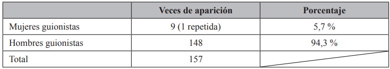 Según la tabla 3, se evidencia una marcada disparidad de género entre guionistas: las mujeres aparecen solamente en 9 ocasiones durante la década analizada, constituyendo un 5,7 % del total, mientras que la presencia masculina alcanza 148 apariciones, equivalente al 94,3 %. Esta pronunciada asimetría en la representación determina sustancialmente la orientación narrativa del contenido humorístico, el cual se construye predominantemente desde una perspectiva masculina. La situación laboral de las guionistas (5,7 %) resulta aún más precaria que la de las directoras (7,7 %) previamente analizadas en términos de reconocimiento profesional.