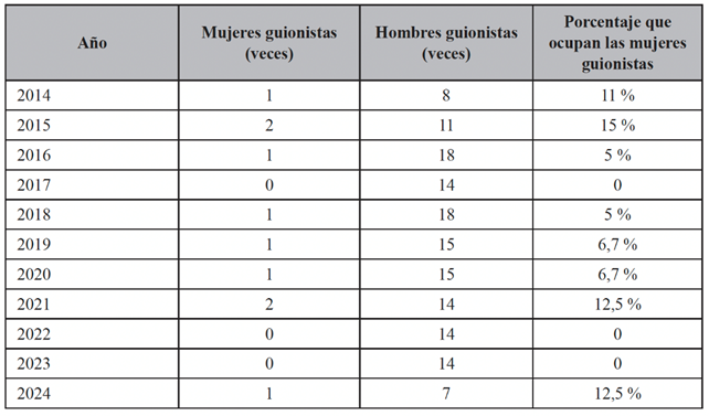 Según se observa en la tabla 4, destaca la ausencia total de guionistas femeninas en las producciones cómicas durante 2017, 2022 y 2023. Por el contrario, 2015 registró el mayor porcentaje de participación femenina, alcanzando un 15 %, aunque esto representara únicamente a dos mujeres. Los años 2021 y 2024 se posicionaron en segundo lugar con una participación femenina del 12,5 % en el diseño y redacción de guiones, superando significativamente a años precedentes como 2019 y 2020, períodos en los que solo se contabilizó una guionista en un equipo total de 16 profesionales. Los años 2016 y 2018 presentaron índices idénticos de participación femenina, situándose en un 5 %, cifra inferior a la registrada en 2019 y 2020.