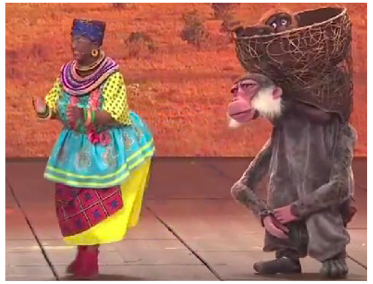 Cuando el trasfondo de la historia se mueve a África, las madres africanas que salen en el escenario de China no tienen otras ideas sino casar a sus hijas a “un hombre rico y guapo”, porque “ahora que es azafata en el ferrocarril Mombasa-Nairobi, su estatus ha cambiado”, y está “más guapa que nunca”. De acuerdo con la madre, contraer el matrimonio con dicho hombre es un símbolo del “triunfo en la vida” (Lou y Liu, 2018, 3m16s). Lo más irónico es que la madre humilde es interpretada por la misma directora de la comedia, quien se disfraza de keniana, representando un estereotipo sobre las mujeres africanas (figura 2).
