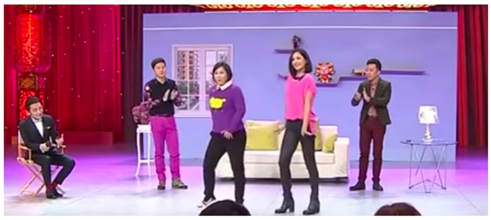 En el sketch titulado ¡Alegría sobre alegría! /Xi Shang Jia Xi de 2022 (Sun y Guo), hay otros diálogos que representan el “horror” que sienten las mujeres hacia su cuerpo. En efecto, es un miedo imaginario impuesto por los hombres a las mujeres, donde una silueta de “calabaza” es la que supuestamente puede llamar la atención del sexo masculino. No obstante, las opiniones dóciles que han sido interiorizadas por las mujeres son, en esencia, exhortaciones de una sociedad patriarcal. Cuando ellas realizan actividades fuera de casa, actúan de acuerdo con las reglas establecidas por la educación machista, olvidándose de lo que realmente desean con certeza. Por lo tanto, la protagonista se muestra sumisa cuando quiere iniciar una relación romántica con su compañero de baile. Ella presume la importancia de una línea corporal “perfecta” para conseguir el amor, quejándose de que comer poco para mantener la figura es difícil, sin tener en cuenta la salud: