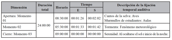 Para enfocar al campus universitario de manera activa en el territorio se abordan tres momentos enfocados en la fijación temporal auditiva denominada: Cantos de la selva; Fenómeno meteorológico y Serenidad nocturna (tabla 4).