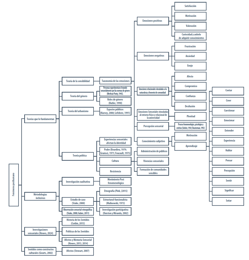 Nota. La imagen representa una cartografía conceptual y sistemática del fenómeno posthumano, considerando cuatro dimensiones interconectadas: las teorías explicativas de sensibilidad, género, urbanismo y política inclusivas (teoría posfenomenológica) que incluyen métodos como la investigación cualitativa y etnografía sensorial; las investigaciones sensoriales que integran cuerpo, afectos y territorio; la construcción de significados mediante encarnación y corporeidad en prácticas educativas. Con esta estructura se hace posible comprender el posthumanismo en contextos educativos a partir de configuraciones afectivas, políticas, comunitarias que dan visibilidad a modalidades de existencia, aprendizaje y relación desde lo multisensorial y relacional.
