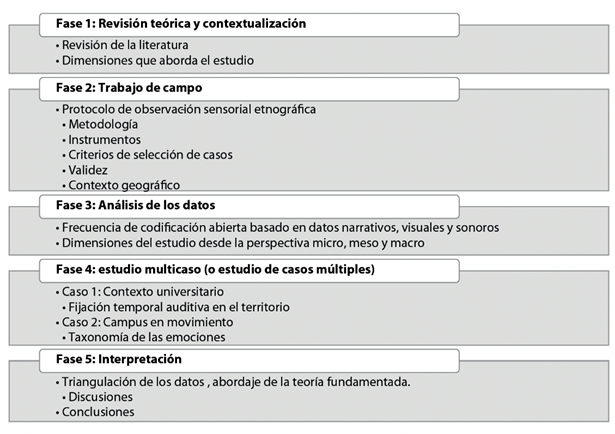 Este estudio adoptó un enfoque metodológico cualitativo (Denzin y Lincoln, 1998), impulsado por el deseo de comprender cómo las experiencias sensoriales y emocionales en entornos universitarios configuran nuevas formas de interacción académica, identidad territorial y construcción de conocimiento transdisciplinario. Este recorrido metodológico se dividió en cinco fases (ver figura 1) interconectadas que permitieron la integración de la teoría, la experiencia de campo, el análisis y la interpretación desde una perspectiva sensible al entorno y a los actores educativos, que a continuación se describen.