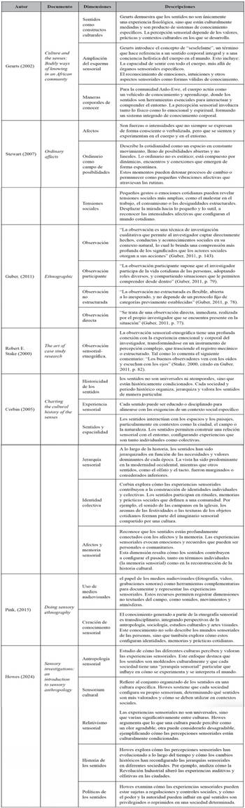 Nota. Elaboración de acuerdo con los documentos con acceso abierto en plataformas de los autores: Corbin (2005); Geurts (2002); Howes (2024); Pink (2015); Stewart (2007), citados en el creciente campo de los estudios sensoriales (Howes, 2014). Se utiliza la técnica scanning, la cual realiza un escaneo rápido para identificar palabras claves y sus significados. Para la técnica de observación se describen las diferentes técnicas con base en Guber, (2011) y Stake (2000). Además, se aborda un subrayado que destaca las ideas principales del texto con líneas y anotaciones.Trabajo de campo