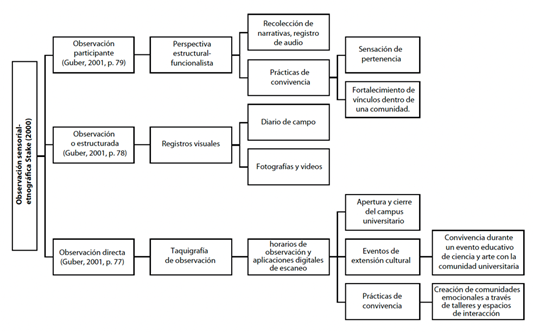 Para este estudio, las tipologías de observación de Guber (2011) permitieron conceptualizar, descritas en la tabla 1 para su aplicabilidad a través de las relaciones dinámicas de las prácticas convivenciales y la vida en el campus universitario como parte de un sistema cultural holístico subyacente.