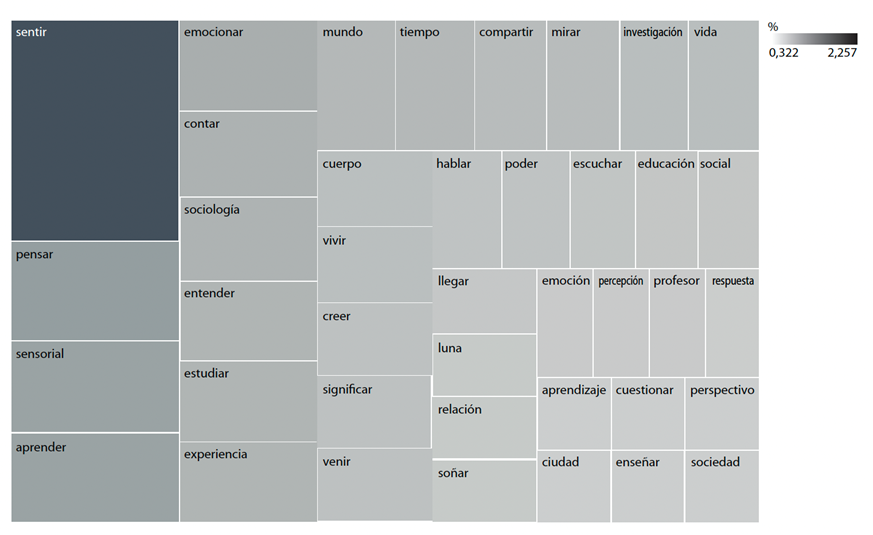Finalmente, en la quinta fase, los hallazgos se interpretaron mediante la triangulación de los datos y el uso del enfoque de la teoría fundamentada (Glaser y Strauss, 1967). Esta etapa permitió integrar las voces, los sonidos, las imágenes y los significados en una narrativa compleja sobre la universidad como territorio sensible. Las conversaciones se centraron en la importancia de los sentidos y las emociones como mediadores del conocimiento, en la importancia de crear ambientes emocionalmente positivos y en el papel estratégico de la extensión universitaria como espacio de articulación entre el saber académico y la vivencia social.