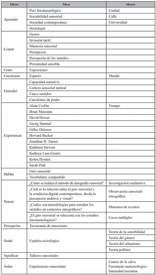 Por último, el macro integra estas experiencias en estructuras socioculturales más amplias como: ciudad, sociedad contemporánea, teoría de género, política, estudios urbanos y sensibilidad. En este caso, sitúa los fenómenos a nivel regional o global mientras interpreta las relaciones entre territorio, cuerpo y conocimiento. Por lo tanto, la tabla facilita la interpretación del fenómeno sensorial en un entorno universitario desde una perspectiva transdisciplinaria y multiescalar situada.