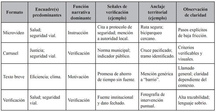 El examen del corpus identifica una presencia recurrente de cinco encuadres operativos en movilidad: salud, seguridad vial, justicia, eficiencia y clima. Los microvideos se asociaron con mayor frecuencia a salud y seguridad vial cuando cumplen función de instrucción, pues articulan verbos de acción, objetos claros y condiciones de ejecución, reduciendo ambigüedad y fricción cognitiva. Los carruseles privilegiaron justicia y salud en piezas de verificación, donde la secuencialidad permite exponer reglas y anclar evidencias en territorio. Los textos breves oscilaron entre eficiencia y clima, con desempeño dependiente del anclaje espacial y de la presencia de fuentes. Esta distribución sugiere que el formato condiciona la forma de plantear problema, causa, solución y responsabilidad, en línea con marcos de análisis de encuadres que recomiendan definiciones operativas y reglas estables de codificación para sostener comparabilidad y replicabilidad (Matthes y Kohring, 2008; Krippendorff, 2018; Helgeson et al., 2022).
