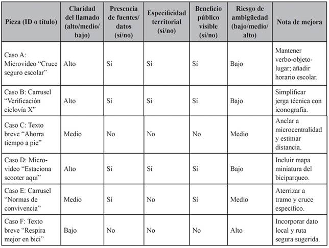 En términos de política pública, las ciudades intermedias presentan condiciones favorables para escalar estas pautas si se articulan comunicación verificable, infraestructura segura y gobernanza adaptativa. Resulta recomendable institucionalizar plantillas por caso de uso, alinear repertorios editoriales con etapas de cambio y programar ventanas comunicacionales próximas a la implementación de cruces pacificados, biciparqueos o corredores calmados, de modo que el mensaje se sostenga en evidencias visibles y no en promesas genéricas. La agenda inmediata incluye operacionalizar una rúbrica de calidad narrativa, reforzar coordinación con actores de reputación territorial y consolidar rutinas de evaluación antes y después de cada intervención. Aunque la ausencia de doble codificación y de series independientes limita la generalización y el contraste inferencial, el conjunto de reglas operativas, plantillas y salvaguardas propuestas constituye un instrumental transferible para traducir metas de sostenibilidad en microdecisiones observables, apoyado en estándares que facilitan la lectura ciudadana del espacio y reducen fricción de inicio (NACTO, 2023; Buehler y Pucher, 2012; Heinen et al., 2011).