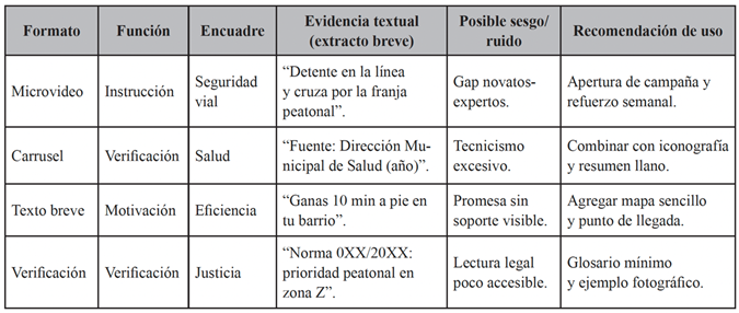 La lectura comparada indica que ciertas combinaciones alcanzan mayor claridad operativa sin recurrir a métricas propietarias. Cuando el objetivo es modificar un gesto específico de seguridad en cruce o tramo, los microvideos de instrucción con encuadre de seguridad vial resultan los más eficaces en términos cualitativos, porque condensan un llamado único y concreto y suelen incluir una señal de verificación. Para legitimar cambios en el uso del espacio urbano, los carruseles de verificación con encuadres de salud o justicia integran fuente fechada, criterio técnico y visual del beneficio público, lo que estabiliza la interpretación y reduce reactancia. En la activación de trayectos cortos, el texto breve funciona si especifica nodo, horario y beneficio plausible y, preferentemente, añade un mapa simple. Estas reglas de decisión derivan de patrones observados y se alinean con recomendaciones sobre claridad, trazabilidad y adecuación cultural en narrativas breves de sostenibilidad (Guenther et al., 2023; Venditti et al., 2017).