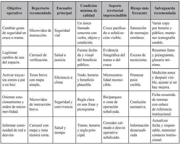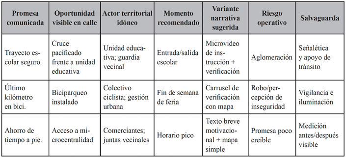 Las reglas de decisión propuestas implican ajustar el diseño editorial al soporte físico disponible y al momento de la intervención, evitando disonancias entre promesa y oportunidad real. La literatura técnica respalda priorizar entornos autoexplicativos, redes continuas y elementos básicos de seguridad que faciliten la lectura ciudadana del espacio vial, pues el diseño urbano condiciona la plausibilidad del llamado comunicativo y su ejecución sin fricción (NACTO, 2023; International Transport Forum, 2024). En campañas de activación de trayectos cortos, los mapas simples y la referencia a microcentralidades convierten argumentos de eficiencia o clima en rutas factibles, mientras que, para legitimación de cambios de uso, los carruseles con norma y evidencia visual reducen los costos cognitivos de aceptación. Este acoplamiento favorece aprendizajes iterativos y evita externalizar en la comunicación problemas resolubles por diseño urbano.