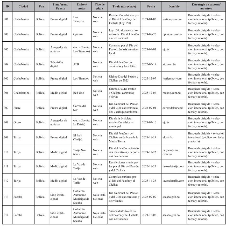 El corpus analizado se reconstruyó a partir de registros disponibles y fuentes públicas archivadas, depurando duplicados por coincidencia de encabezado, dominio y metadatos visibles. El corpus final verificable quedó compuesto por N=14 piezas con autoría institucional o mediática identificable, fecha visible y acceso público, cuyo registro normalizado por pieza (ciudad declarada, plataforma de observación, emisor, formato, fecha visible, tipo de evidencia y código interno) se consigna en el Anexo A1. La procedencia corresponde a prensa digital, televisión digital y sitios institucionales; la ventana temporal abarca del 02/04/2024 al 07/12/2025, y la cobertura territorial incluye ciudades intermedias de Bolivia (Cochabamba, Sacaba, Sucre, Oruro y Tarija). La estrategia de captura combinó búsqueda dirigida por palabras clave vinculadas a movilidad activa, micromovilidad, día del peatón y seguridad vial, con muestreo intencional por pertinencia temática y disponibilidad de metadatos, de modo que la selección no dependiera de inferencias territoriales o de atribuciones no declaradas. Se excluyeron duplicados, piezas sin fecha visible o sin autoría identificable y contenidos no vinculados directamente con movilidad sostenible.