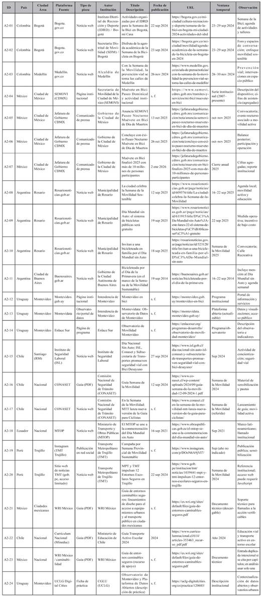 Nota. Corpus de referencia para contextualización no codificada: Nref=24 unidades listadas. Selección realizada por muestreo intencional y disponibilidad pública. Se aplicó una búsqueda por palabras clave (p. ej., “semana de la movilidad”, “día sin auto”, “movilidad activa”, “bicicleta pública”, “muévete en bici”), con filtrado por identificación institucional o municipal y registro de metadatos (fecha, plataforma y ciudad/país). En los casos en que la página fuente requiere JavaScript o presenta restricciones de acceso, se conserva el enlace únicamente como referencia de procedencia.