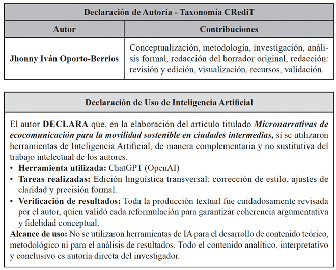 Oporto-Berrios, J. I. (2026). Micronarrativas de ecocomunicación para la movilidad sostenible en ciudades intermedias. Universitas XX1, 44, pp. 83-118. https://doi.org/10.17163/uni.n44.2026.04