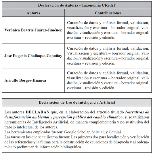 Juárez-Jiménez, V. B., Chafloque-Capuñay, J.E. y Borges-Huanca, A. (2026). Narrativas de desinformación ambiental y percepción pública del cambio climático. Universitas XX1, 44, pp. 119-147. https://doi.org/10.17163/uni.n44.2026.05