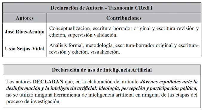 Rúas-Araújo, J. y Seijas-Vidal, U. (2026). Jóvenes españoles ante la desinformación y la inteligencia artificial: ideología, percepción y participación política. Universitas XX1, 44, pp. 261-283. https://doi.org/10.17163/uni.n44.2026.10