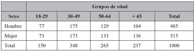 El trabajo de campo se llevó a cabo entre el 1 y el 15 de febrero de 2025, teniendo en cuenta como universo del estudio la población española mayor de 18 años. La muestra final obtenida está compuesta por un total de 1000 individuos, por lo que, en el escenario más desfavorable (p = q) y con un nivel de confianza del 95,5 %, el margen de error es de ± 3,1 %. La muestra incluye todas las regiones de España y se estratificó proporcionalmente a la población real por cuotas de sexo y edad, como se puede apreciar en la tabla 1.