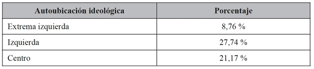 En lo que respecta a la autoubicación ideológica de los jóvenes de entre 18 y 28 años, se puede observar un mayor posicionamiento hacia la derecha (36,50 %), seguido por la izquierda (27,74 %) y el centro (21,17 %). En este caso, los extremos ideológicos quedan relegados a un segundo plano, optando por la extrema izquierda únicamente el 8,76 % de la muestra analizada y el 5,84 % en el caso de la extrema derecha. De esta forma, en términos generales, se puede decir que existe una pequeña tendencia hacia la derecha en los jóvenes analizados, 42,34 % frente al 36,5 % respectivamente (suma de porcentajes de derecha más extrema derecha y viceversa). Sin embargo, la diferencia no es suficiente como para hablar de una imposición clara de una ideología sobre otra.