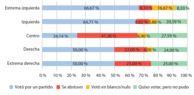 En cuanto al tipo de participación en las elecciones generales de 2023, los datos evidencian que las personas que se ubican a la izquierda (también extrema) presentan una mayor tasa de votación hacia un partido concreto, con un 64,71 % y 66,67 % respectivamente. Estos porcentajes son menores en el caso de la derecha y su respectivo extremo ideológico, siendo en ambos posicionamientos un 50 %. Esto se debe a que parte de sus simpatizantes han optado por abstenerse (22 % y 25 %, respectivamente) o no han podido ejercer su derecho al voto a pesar del deseo de hacerlo (24 % y 25 %). Cabe puntualizar que esta última situación también le sucedió al 20,59 % de las personas declaradas de izquierda y al 27,59 % del centro. Por su parte, la extrema izquierda muestra un mayor porcentaje de votos en blanco o nulos (16,67 %), siendo la única con una puntuación tan alta en esta categoría. Llama especialmente la atención el caso de las personas del centro, cuyo porcentaje de votación es el más bajo entre las diferentes ideologías (24,71 %) y cuyo porcentaje de abstención es el más alto respecto a las demás (41,38 %).