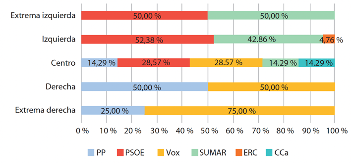 Entre las personas votantes, la mayoría de los que se autodenominan de extrema izquierda se decantaron por el PSOE y Sumar (50,00 % de recuerdo de voto en las elecciones generales de 2023). En cuanto a la izquierda, los votos se repartieron de forma semejante, con un 52,38 % para el PSOE, un 42,86 % para SUMAR y, como novedad, un 4,76 % para ERC. Mientras tanto, las personas que se ubican en el centro dividieron sus votos a diferentes partidos, concentrando la mayoría en partidos como PSOE y Vox (28,57 % de recuerdo de voto), seguidos de PP, SUMAR y CCa (14,29 % de recuerdo de voto).