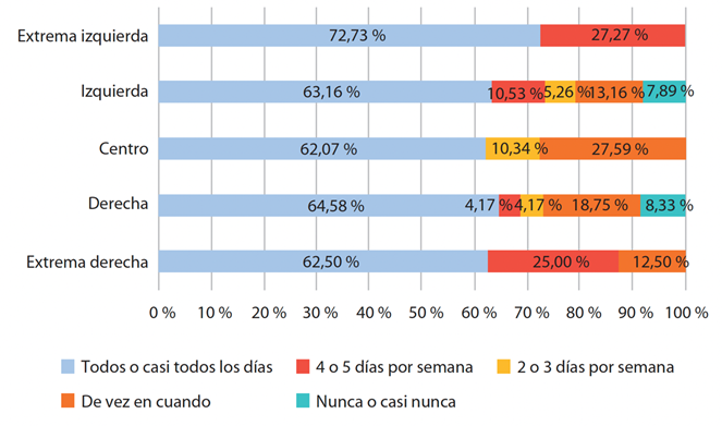 Sin embargo, cabe destacar que, tal y como refleja la figura, los jóvenes de los extremos (tanto de izquierda como de derecha), tienden a seguir con mayor frecuencia estos contenidos a través de internet, siendo el 100 % de los casos de la extrema izquierda quienes se informan, al menos, 4 días a la semana y el 87,5 % de la extrema derecha (suma de porcentajes de “Todos o casi todos los días” y “4 o 5 días por semana”). Por su parte, la izquierda y la derecha, reparten sus porcentajes entre las diversas categorías, incluyendo también opciones como “Nunca o casi nunca” (7,89 % y 8,33 % respectivamente) y “De vez en cuando” (13,16 % y 18,75 % respectivamente). Esta última también es la opción mayoritaria entre los individuos restantes del centro (27,59 %) junto con “2 o tres días por semana” (10,34 %).