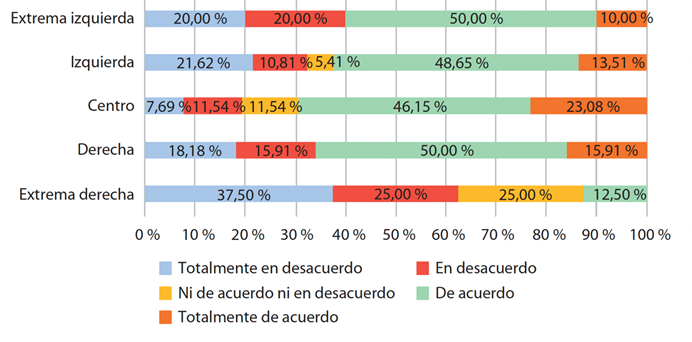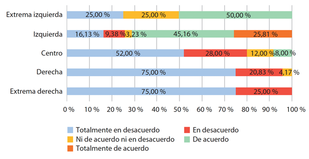 Únicamente un grupo difiere con respecto a los demás: los que se autoubican en la extrema derecha, que se muestran totalmente en desacuerdo (37,5 %) o en desacuerdo (25,00 %). También cabe destacar que un 25 % de estos jóvenes no se pronuncia ni a favor ni en contra, seleccionando la opción “ni de acuerdo ni en desacuerdo”. Aunque existen individuos que se posicionan de acuerdo con la afirmación analizada, estos solo representan el 12,50 % del total de simpatizantes con la ideología de extrema derecha.