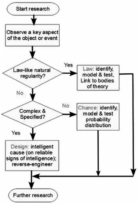 These characteristics help identify whether the character of an event or object is attributable to some law, to chance, or to design (see Figure 1 for a visualization of the explanatory filter). An advocate of ID (ID’ist) first excludes the possibility of a natural law explaining the contrivance - if this is not the case; the item is checked for complexity and specificity. If it is complex and specific, the ID’ist proceeds to ‘reverse engineer’ the item. According to Dembski (1999), this reverse engineering is “ID’s positive contribution to science” (p. 108). He continues, “Having determined that certain natural objects are designed, the design theorist next investigates how they were produced. Yet because evidence of how they were produced is typically incomplete (at least for natural objects), the design theorist is left instead of investigating how these objects could have been produced”. No further instructions follow, however. Apart from this lack of description, there is an issue to which we will return when evaluating the criteria; ID seemingly takes the stance that it knows how an intelligent designer would or could act. Hidden behind this‘investigative’ veil is a normative position on intelligence, that is centered entirely around a fundamentally human understanding of it. With this human understanding also comes the notion of privileging human preconceptions of purpose and meaning, which we comment on in our analysis.
