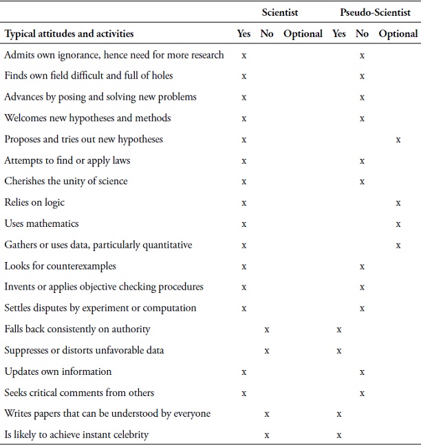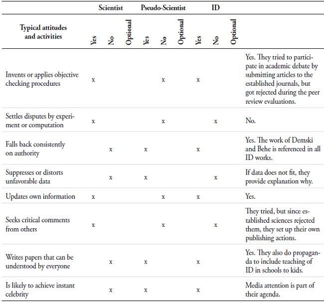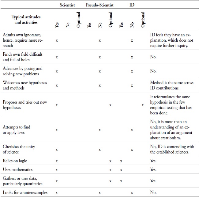 If we look to Bunge’s (1984) account of pseudoscience as a cognitive field, “(...) a sector of human activity aiming at gaining diffusing, or utilizing knowledge of some kind (...).” (p. 36), we obtain a tool to evaluate ID as a whole. Rather than looking solely at the science of the work, his method covers areas beyond the formal matters of logical detail in tests. He proposes the use of a table that describes attitudes and practices of scientists and pseudo-scientists (Table 1) and draws a clear line of demarcation between the two positions. The criteria are provided in the table below.