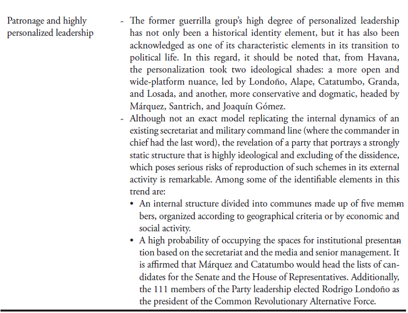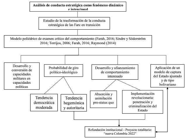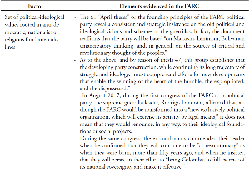 The use of this qualitative model to review the group's behavior brought forth the following: a) That the guerrillas continue their process of adaptation and strategic insertion in the new dynamics of peace and conflict in Colombia. Moreover, there are some elements of judgment that hint towards their advancement within the framework of a Bolivarian-type adjusted state capture model; b) Regarding the likelihood of political-ideological turnaround, the screening of study factors for armed groups in transition reveals that there can and should be a concern that the FARC is the "wrong type of political group"; that is, that in the end, they constitute a political party without the capacity or will to sustain genuine democratic lines; and c) Regarding the development and consolidation of the interested behavior, there are several problematic issues when considering the possibility that the integration of the FARC into the formal political system manages to "tame and moderate" its anti-democratic and authoritarian values.